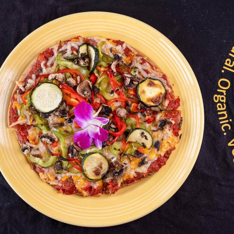 Soy free. Marinara sauce, Daiya cheese, zucchini, red bell pepper, and mushrooms.