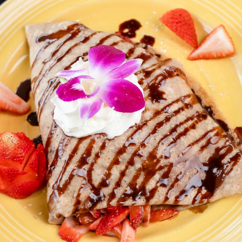 Soy free. Blackberry spread, powdered sugar, and whipped cream. Add our seasonal fruits or syrup -chocolate syrup or cherry spread each for an additional charge.