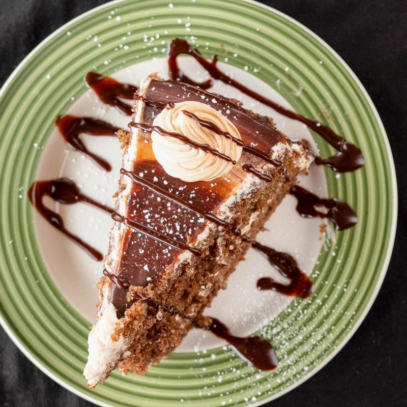 Chocolate mousse, strawberries, chocolate syrup & whipped cream.