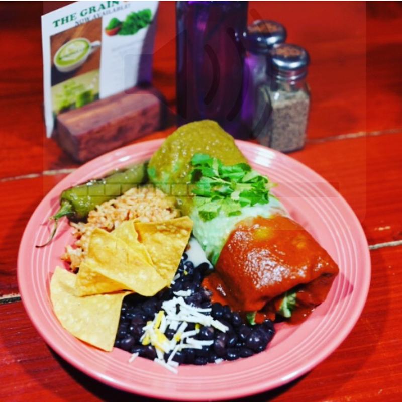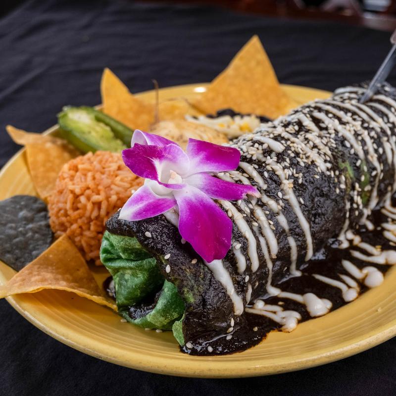 Daiya cheese, mushroom, onions, zucchini, cabbage, chard, bell peppers with your choice of chicken, tempeh or burger patty wrapped in a spinach tortilla topped with our homemade mole sauce.