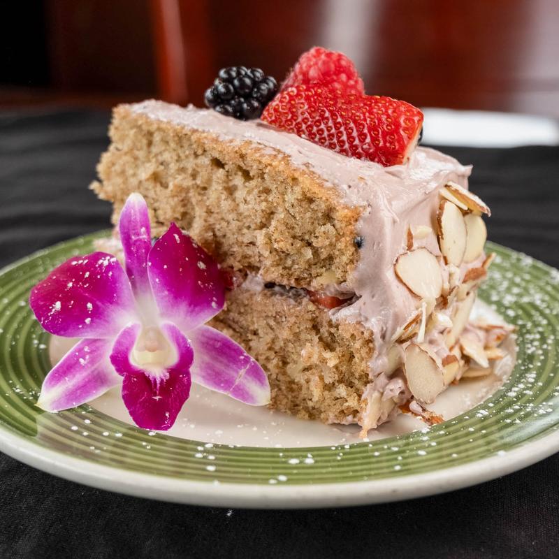 Whole wheat bread soaked in vanilla soy milk served with seasonal fruits.