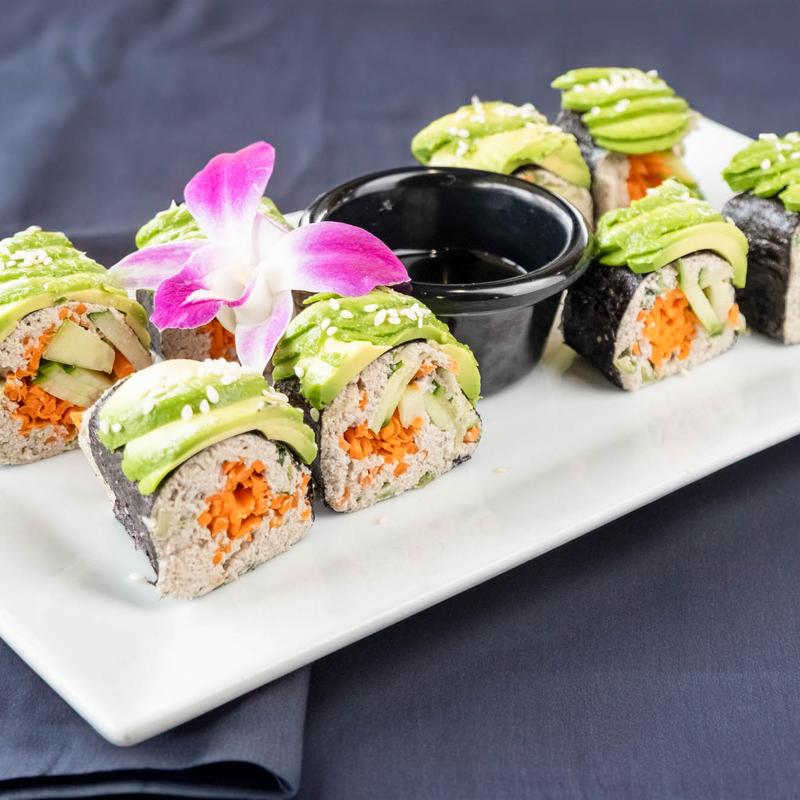 Tuna, cucumber, carrots, and avocado served with soy sauce.