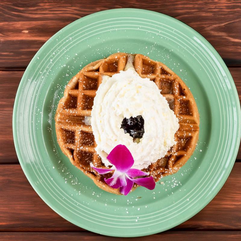 Waffle, tofu egg, vegan sausage or chicken fingers, whipped cream, and hashbrowns. Gluten Free upon request.