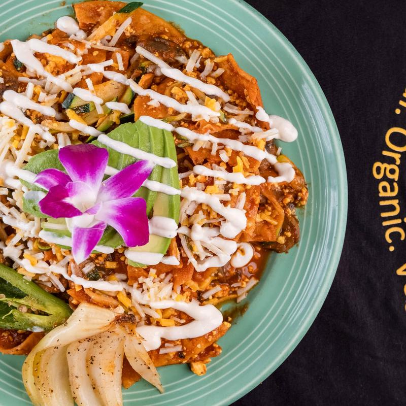 Gluten-free. Corn tortilla chips, zucchini, mushroom, avocado and tofu egg sautéed in a salsa roja topped with homemade sour cream and Daiya cheese.