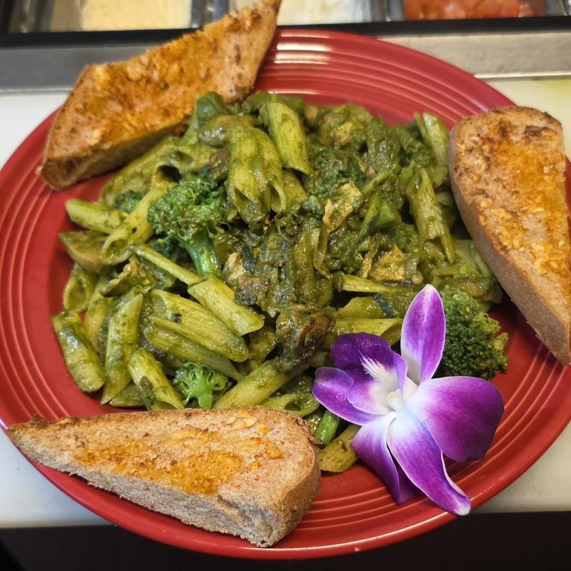 Chicken, broccoli, zucchini, mushroom, green bell pepper and spinach with pesto sauce.