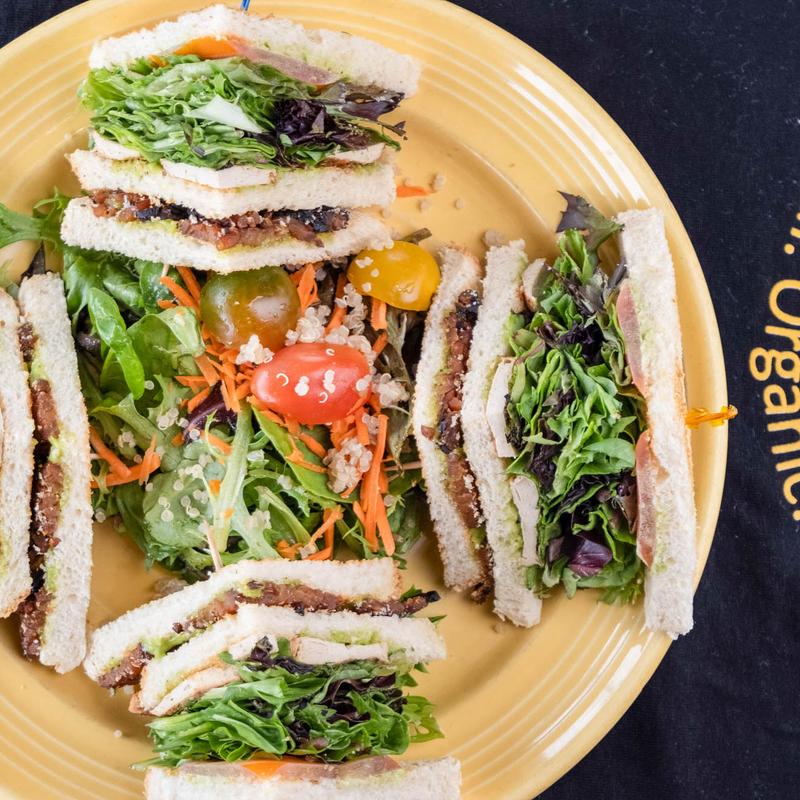 Marinated chicken, lettuce, tomato and smoked tempeh bacon served on sourdough bread with a garlic aioli sauce. Add avocado for an additional charge.