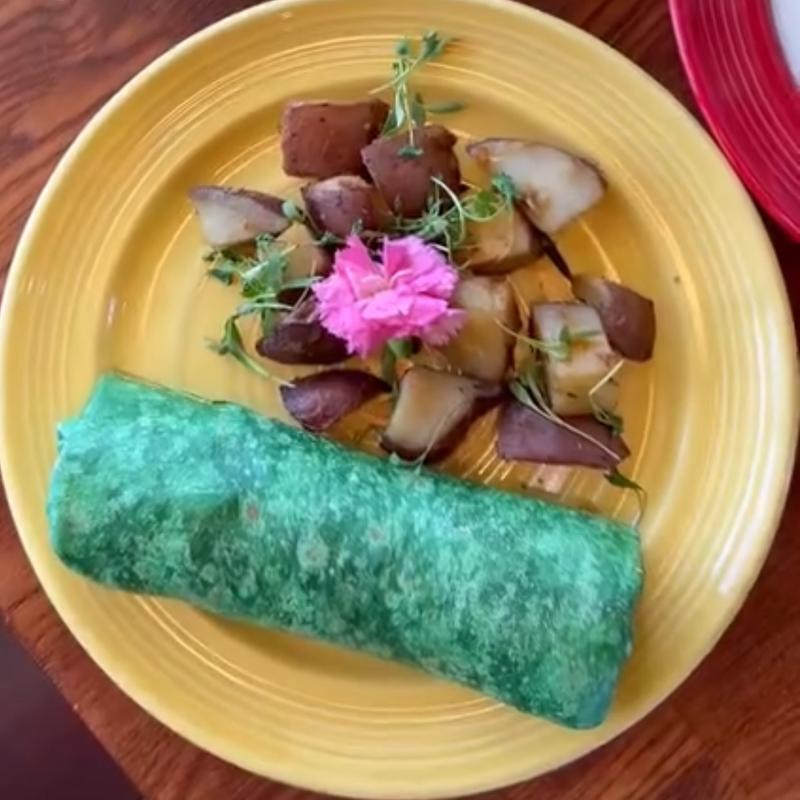 Tofu egg, onions, red and green bell peppers, mushroom, spinach and avocado served with roasted potatoes and toast. Gluten Free (GF) upon request for an additional charge.